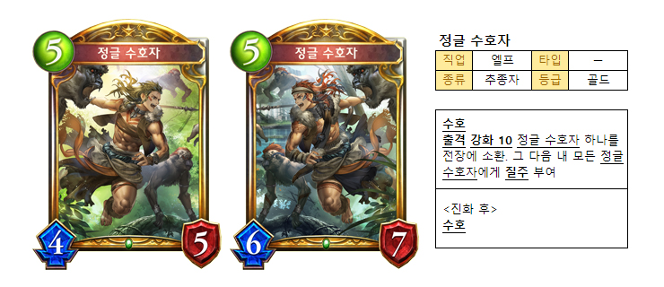 ‘정글 수호자’는 수호와 강화 능력을 지닌 추종자다. 특히 강화되면 정글 수호자 하나를 전장에 소환하고 질주 효과가 부여돼 4대미지를 두 번에 걸쳐 줄 수 있는 것이 특징이다.