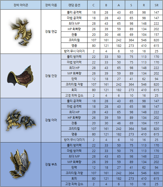 ▲ 탑승펫 전용 장비 4종의 등급별 랜덤 옵션 종류와 능력치 (1레벨 기준)