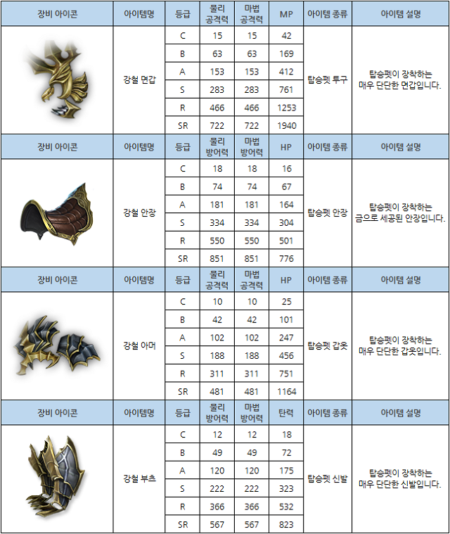 ▲ 탑승펫 전용 장비 4종의 등급별 능력치 (1레벨 기준)