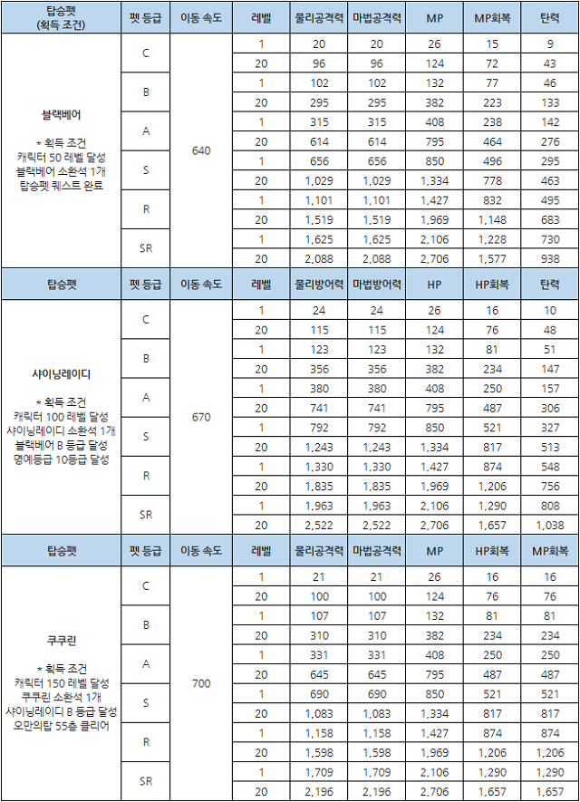 ▲ 탑승펫 3종의 레벨 및 등급별 능력치