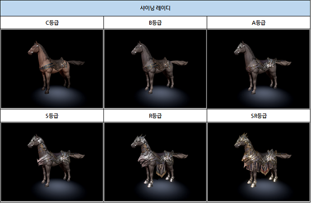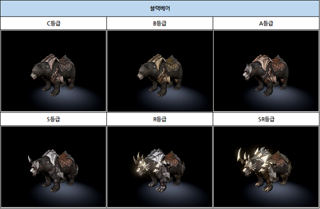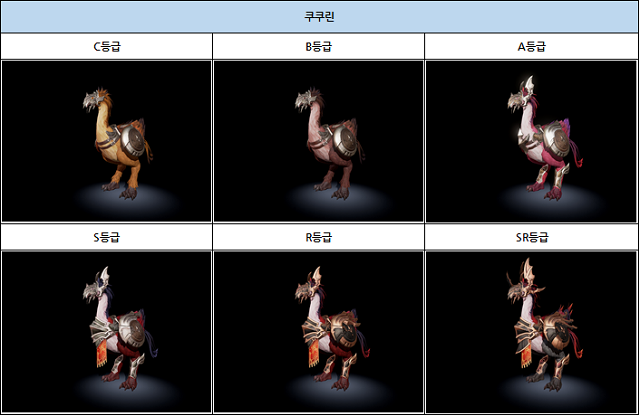 탑승펫의 승급은 총 6단계가 있으며 장비와 동일하게 C/B/A/S/R/SR 등급으로 나뉜다. 따라서 탑승펫이 가지는 외형도 6가지로, 각 종류 및 등급별 모습은 아래의 그림과 같다.