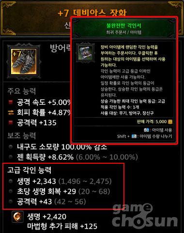 불완전한 각인서만큼 쉽게 구할 수 있는 것은 아니지만, '푸른 각인서' 등 상위 각인서가 존재하여 3개까지 옵션이 부여되기도 하므로 투자하면 투자할수록 능력치 상승 효과를 기대할 수 있다.