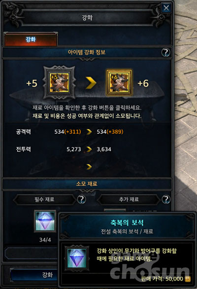 '축복의 보석'은 '블러드캐슬'이나 '시공의틈', '포리스탈'을 사용해 하루 기본 수량을 모을 수 있다. 여유 있다면 3단계까지도, 못해도 1단계까지 강화하는 것을 추천하고, 나에게 꼭 맞는 옵션의 장비가 있다면 5단계까지도 노려볼 만 하다. '무기' - '상의' - '하의' 순으로 강화 중요도가 높다는 점을 기억하자.
