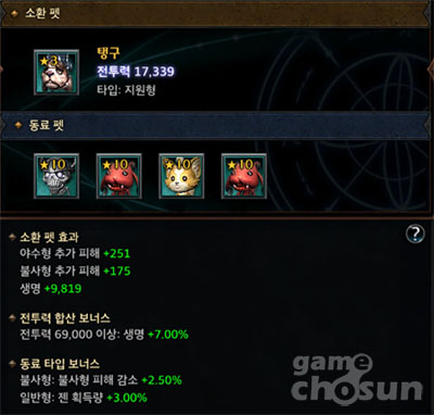 누구나 기본 펫은 이미 10성을 달성했겠지만, 그보다 중요한 것은 바로 동료 펫 설정과 동료 펫의 성장이다. 기본적으로 동료 펫 슬롯은 하나만 열려 있기 때문에 나머지 동료 펫 슬롯을 모두 열어 기본 펫1, 동료 펫 4을 모두 데리고 다니는 것이 좋으며, 동료 펫 역시 10성까지 모두 육성하여 능력치를 끌어올리는 것이 좋다.