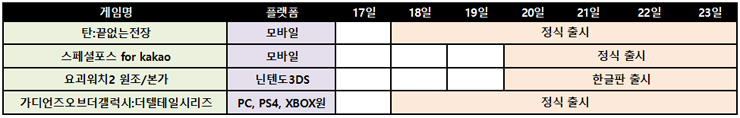 콘솔게임으로는 가디언즈오브더갤럭시:더텔테일시리즈가 18일, 요괴워치2가 20일 발매된다.