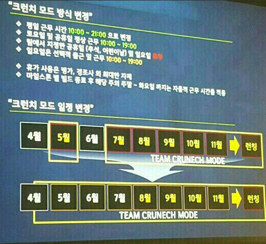 한편, '크런치 모드'는 게임 출시 및 업데이트 등 정해진 마감일을 맞추기 위해 야근과 밤샘 작업을 반복하는 기간을 칭하는 말로 쓰인다.