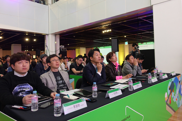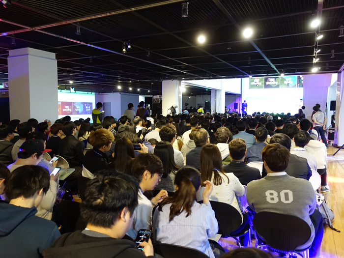 현장에는 게임을 즐기고 평가하기 위해 몰린 관람객으로 가득 채워졌으며, 우수작으로 선정된 작품의 프리젠테이션을 귀 기울여 듣는 모습이었다.