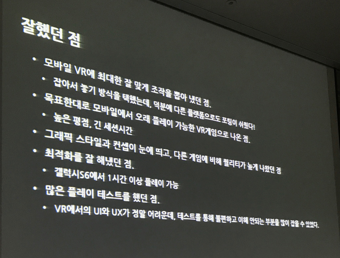 마지막으로 그는 "모바일 VR에 최대한 잘 맞게 조작을 찾은 덕분에 다른 플랫폼으로 이식하는 것이 쉬웠다. 향후 어떤 방식의 조작법이 나올지 모르겠지만 현재 모바일 VR에서는 잡아서 놓기 방식이 최적의 조작감이라 생각한다. 많은 사람의 테스트를 거칠수록 최적화와 오랜 플레이 시간을 기록할 수 있다는 것"이라고 말했다.