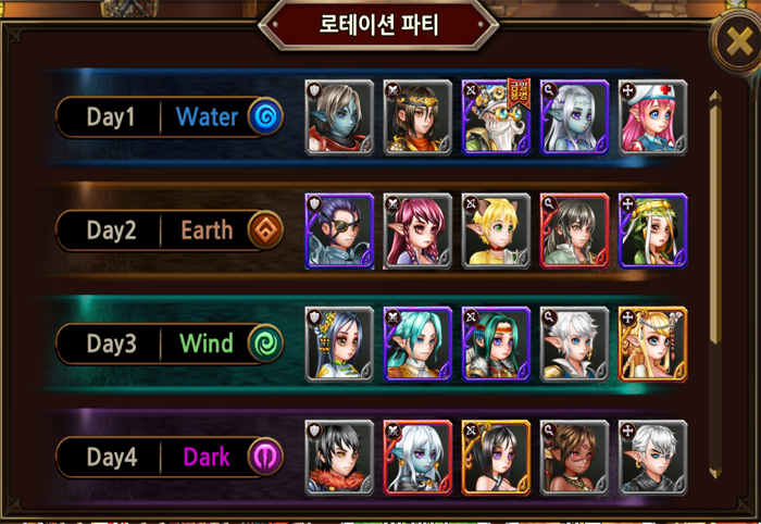 '로테이션 파티'는 5명의 각기 다른 클래스로 이뤄져 있다. 자정이 넘어 로테이션 파티가 변경되어도 용병 캐릭터가 레벨 초기화가 되는 것이 아니라 전날 얻은 경험치가 그대로 남아있다.