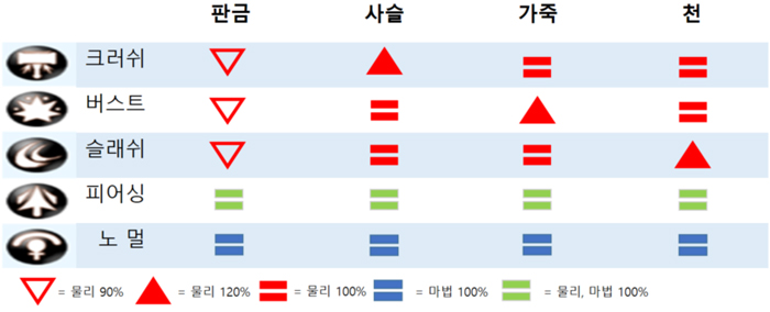 우선 버스트는 사슬 타입에게, 버스트는 가죽 타입에게 120%의 물리 공격력을 입히고 나머지 방어 타입에게 100%의 물리 공격력을 입힌다. 더불어 노멀 타입은 모든 방어 타입에게 80%의 마법 공격력을 입힌다.