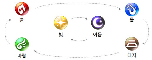 또한 불-바람-대지-물-빛-어둠 6개 속성에 따른 상성 관계가 있어 이를 활용하면 클래스 역할은 더욱 빛을 발한다.