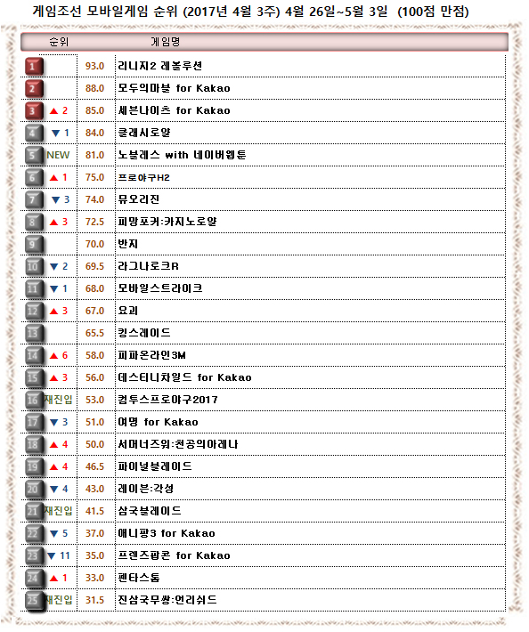 중위권에선 스포츠게임의 약진이 두드러졌다. 축구 게임 '피파온라인3M'은 지난 주보다 6계단 오른 14위에 머물렀으며, 야구게임인 '컴투스프로야구2017'은 이번주 차트 재진입에 성공했다.