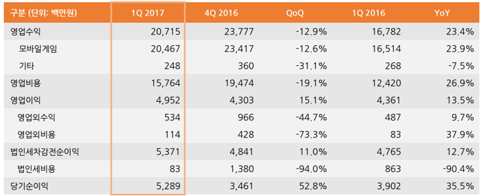 회사 측은 게임 라인업 확대와 함께 지난 해부터 추진한 매출 다변화가 안정화에 접어든 것이 견조한 매출 구조와 사업 효율화에 일조했다고 설명했다.