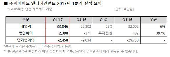 위메이드엔터테인먼트(대표 장현국)가 2017년 1분기 실적을 발표했다.