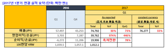 넥슨(대표 오웬 마호니)은 2017년 1분기 연결기준 실적으로 매출 747억9200만엔(한화 7570억원), 영업이익 397억6200만엔(한화 4024억원), 순이익 199억600만엔(한화 2015억원)을 기록했다고 12일 도쿄증권거래소에 공시했다. 기준 환율은 100엔당 1012.1원이다. 전년동기 대비 매출과 영업이익은 각각 30%, 974% 증가했다. 또 순손실에서 흑자전환했다.