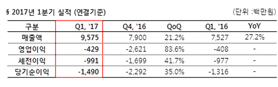 한빛소프트(대표 김유라)가 지난 2017년 1분기에 연결기준 전분기 대비 매출은 20% 이상 오르고 영업손익은 약 84% 개선되는 등 실적개선을 달성했다고 15일 발표했다.