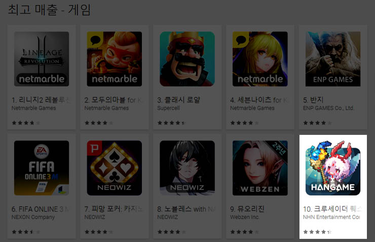 NHN엔터테인먼트(대표 정우진)가 서비스하고 로드컴플릿(대표 배정현)이 개발한 모바일 RPG(역할수행게임) '크루세이더퀘스트'가 17일 구글플레이 게임 부문 최고 매출 순위에서 10위를 기록했다.