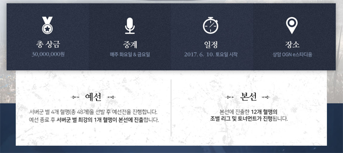 예선전은 6월 10일부터 11일까지 서버군 별 4개 혈맹(총 48개)을 선발한다. 서버군 별 최강의 1개 혈맹이 본선에 진출하며, 본선은 12개의 서버군 대표 혈맹이 출전한다.