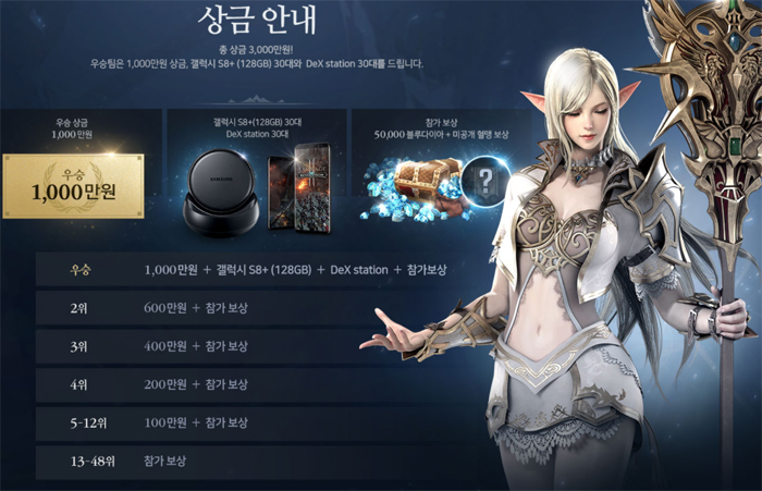 우승한 혈맹에게는 상금 1000만원과 함께 혈맹원 전원에게 갤럭시S8+(128GB)와 삼성 덱스가 증정된다. 2위는 600만원, 3위는 400만원, 4위는 200만원, 5~12위는 100만원이 시상금으로 주어진다.