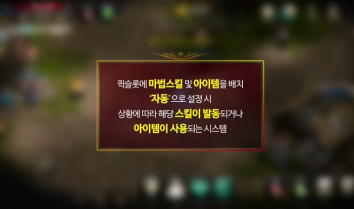 공개된 내용에 따르면 리니지M의 자동스킬은 '퀵슬롯에 마법스킬 및 아이템을 배치한 뒤 '오토' 기능을 활성하면 상황에 따라 해당 스킬이 발동되거나 아이템이 사용되는 시스템'을 말한다.