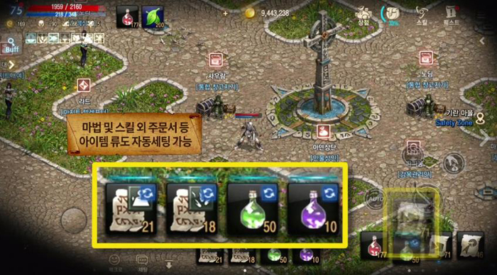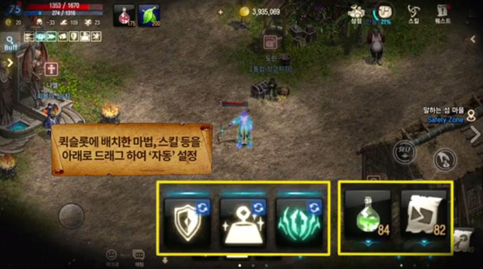 자동스킬 기능은 게임 내에서 하단에 존재하는 퀵슬롯의 마법과 스킬 등을 아래로 드래그해 자동으로 사용하게끔 하는 것이다.