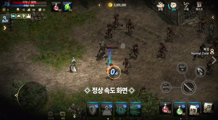 특히 화면 상단에 떠있는 '자동 전투 중'이라는 문구와 우측 하단에 활성화된 AUTO 버튼으로 미뤄봤을 때 이용자가 직접 컨트롤하는 것이 아닌 '자동 사냥'으로 몰이사냥이 가능하다는 것이 입증됐다.