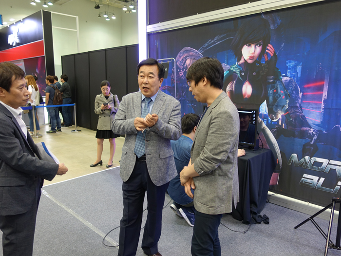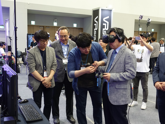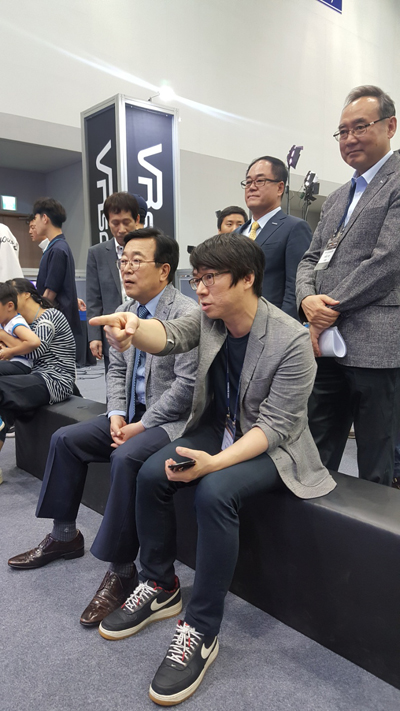 서병수 시장은 서태건 부산정보산업진흥원장과 함께 스코넥엔터테인먼트 부스에 머물며 헤드마운트를 직접 착용하고 VR 게임 '모탈블리츠'를 즐겼다.