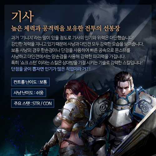 ‘기사’는 모든 클래스와 비교해 압도적인 체력을 보유한 클래스다. 다양한 장비를 활용해 평균 이상의 공격력과 방어력을 갖추기 쉬우며 사냥과 대인전 모두에서 강력한 모습을 보여준다.