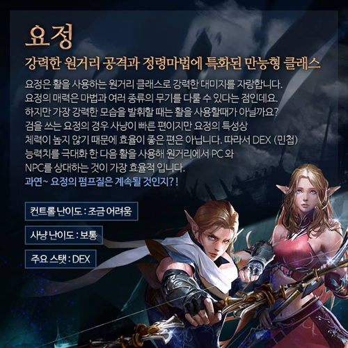 ‘요정’은 주로 활을 사용하는 원거리 공격수다. 검, 마법 등 다양한 선택도 가능하다. 특히 일정 레벨부터 배울 수 있는 정령 마법을 사용하면 회복, 공격, 지원(이로운 효과) 등 다재다능한 역할을 수행할 수 있다.