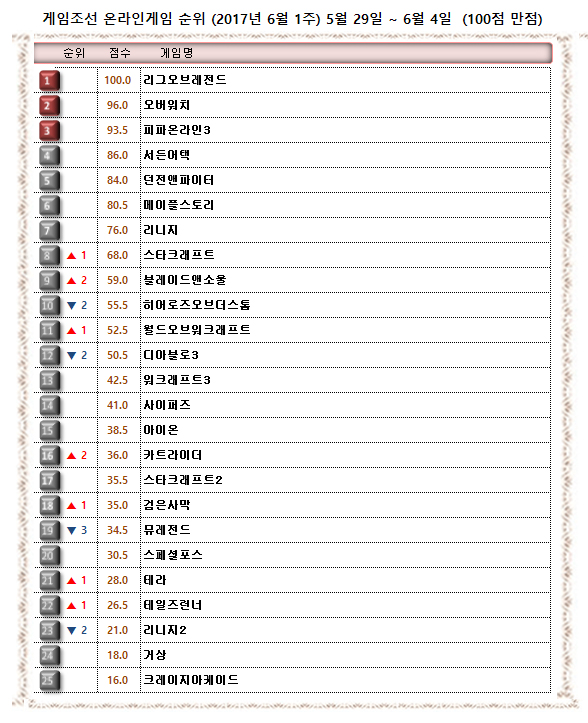 6월 첫째주 온라인게임순위는 중위권 1, 2계단 각축전과 하위권 활발한 순위 변동이 눈에 띈다. 상위권은 ‘리그오브레전드’를 필두로 변화 없이 잠잠했다.