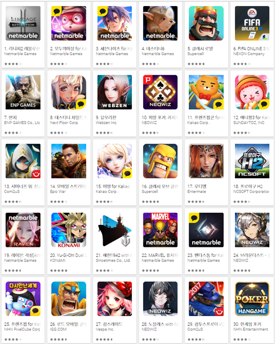 ▲ 2017년 6월 19일 오전 국내 구글플레이 게임부문 최고매출 순위 갈무리