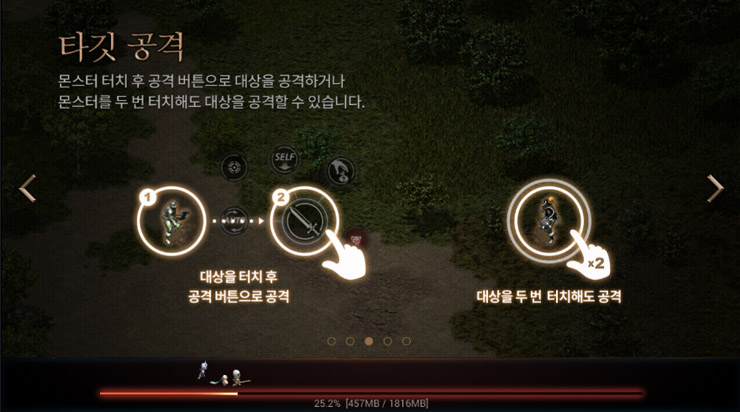 몬스터 공격은 대상을 터치 후 공격 버튼을 눌러 공격하거나 몬스터를 두 번 터치해 공격할 수도 있다.