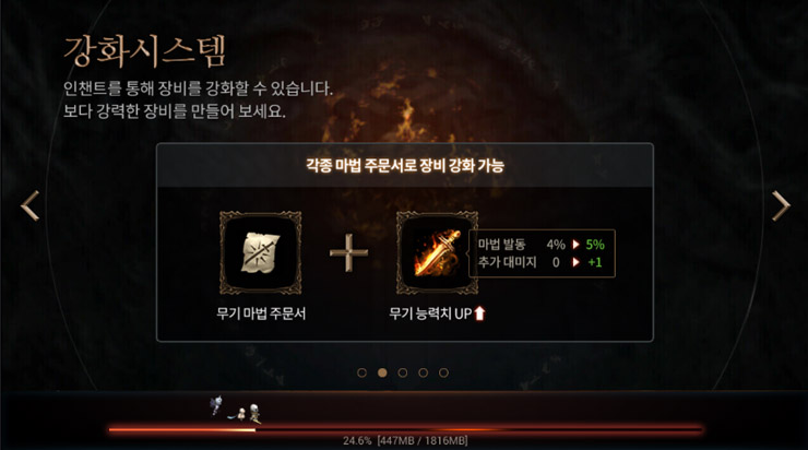 먼저 리니지의 꽃이라 할 수 있는 강화시스템은 무기와 방어구 마법주문서를 통해 무기 능력치를 높일 수 있다.