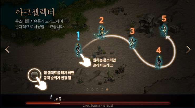 아크셀렉터는 몬스터를 자유롭게 드래그해 순차적으로 사냥하는 방식을 뜻하며 탭 셀렉트를 터치해 공격 순위를 변경할 수도 있다.