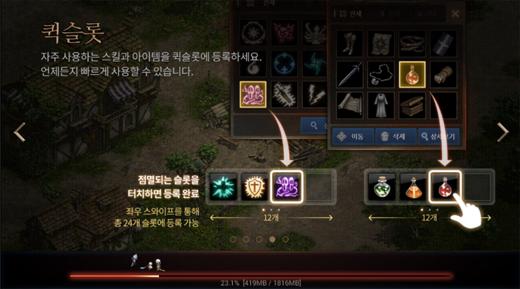 큇슬록은 자주 사용하는 스킬이나 아이템을 등록해 간편히 사용할 수 있고 좌우 스와이프를 통해 총 24개(스킬 12개, 아이템 12