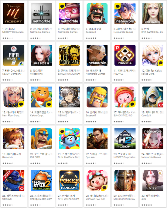 ▲ 2017년 6월 26일 오전 국내 구글플레이 게임부문 최고매출 순위 갈무리