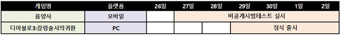 이번 주에는 모바일 기대작 '음양사'가 오는 27일 첫 테스트를 진행하고 디아블로3의 신규 콘텐츠 '강령술사의 분노'가 오는 28일 출시된다.