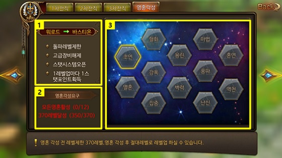 영혼각성은 마치 반지를 회수하여 개방하듯 12개의 영혼을 모두 활성화 시키고 370레벨에 도달했을 때, 4차 전직을 완료할 수 있다. 영혼을 활성화하기 위해서는 다이아로 구매할 수 영혼조각을 이용하거나 일정량 이상의 경험치를 모아 각성할 수 있다.