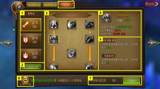 자신이 원하는 방향으로 캐릭터를 성장시킬 수 있는 만큼 다양한 육성이 가능해질 것으로 보인다. 만약 원하지 않는 스탯스킬을 잘못 찍거나 스탯 방향을 변경시키고자 하면 '스탯초기화서'를 이용해 분배한 포인트를 모두 반환받을 수 있다.