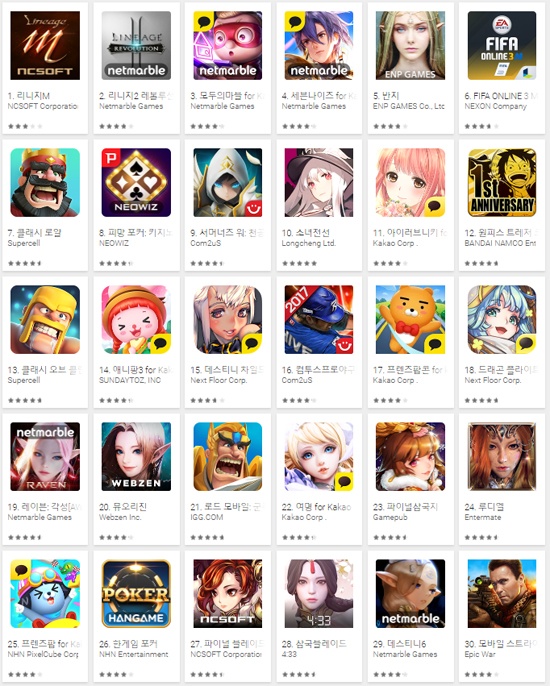 ▲ 2017년 7월 3일 오전 국내 구글플레이 게임부문 최고매출 순위 갈무리