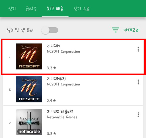 10일 오후 구글플레이 최고 매출 순위에 따르면 엔씨소프트의 신작 MMORPG(다중접속 역할수행게임) ‘리니지M’의 18세 이용가가 1위를 차지했다.