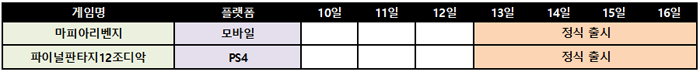 먼저 네시삼십삼분의 모바일 실시간대전게임 '마피아리벤지'가 오는 13일 출격한다. 또 스퀘어에닉스의 '파이널판타지12'가 리메이크돼 13일 정식 발매될 계획이다.