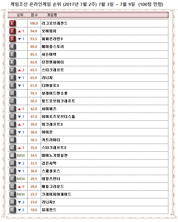 먼저 ‘리그오브레전드’가 1위를 틀어쥔 가운데 ‘오버워치’가 ‘피파온라인3’와의 2위 쟁탈전에서 근소한 차이로 승자가 됐다. ‘스타크래프트’가 리마스터 발표 후 2계단 올랐고 ‘리니지’와 ‘디아블로3’는 각각 1계단씩 내려갔다.