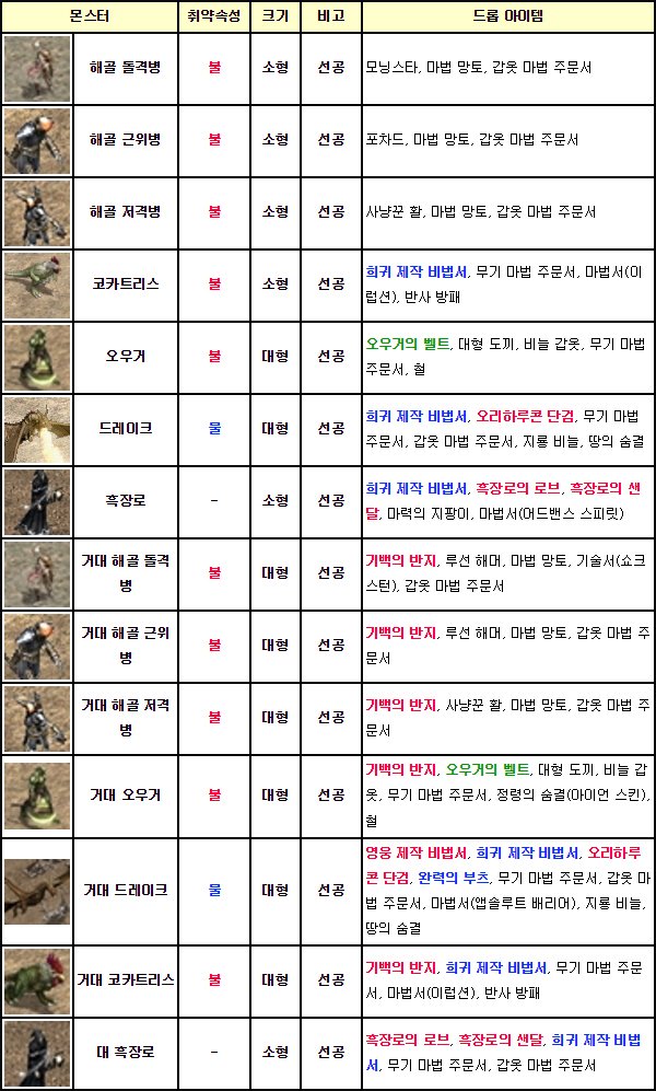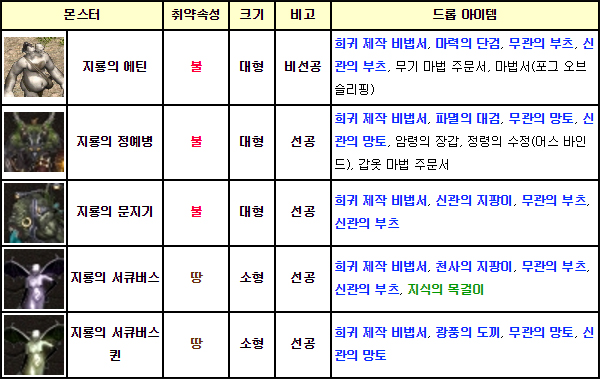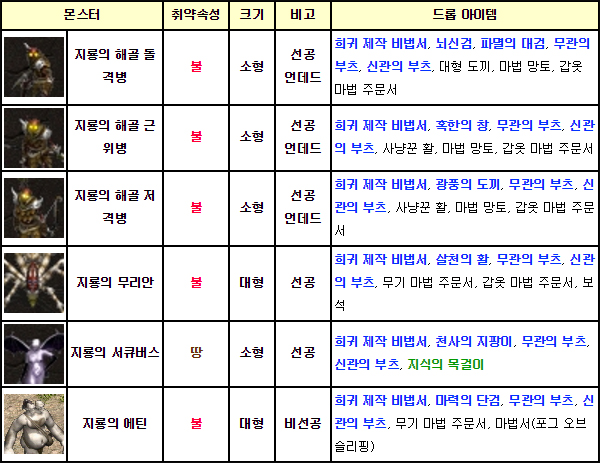 용의 계곡 던전 2층에선 1층에서 등장하던 몬스터에 지룡의 졸개와 무리안이 추가로 등장하는데, 이들이 희귀 아이템을 드랍한다. 지룡의 졸개와 무리안 모두 불속성 공격에 취약하고 마법 방어력도 낮아 파이어 볼, 파이어 스톰 등 마법사 공격으로 공략하기 좋다.