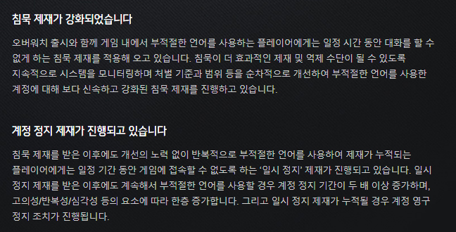 최근 블리자드는 오버워치에서 악성 이용자에 대한 제제를 강화했다. 욕설 이용자에게 침묵 제재 수위를 높이고 고의 패배는 물론 욕설에 대해서도 최대 계정 영구정지 조치까지 하겠다는 입장이다.