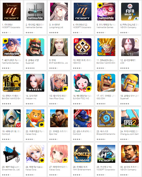 ▲ 2017년 7월 17일 오전 국내 구글플레이 게임부문 최고매출 순위 갈무리