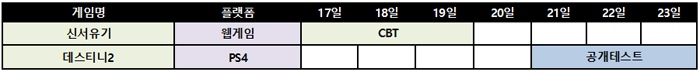 먼저 17일에는 웹게임 신서유기가 비공개시범테스트를 실시하고, 오는 21일에는 PC-콘솔게임 데스티니2가 공개테스트를 진행할 계획이다.