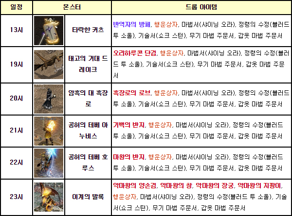 월드 보스 이벤트가 저녁 시간애 집중되도록 일정을 변경했으며 드롭 아이템에 전설, 영웅 아이템을 추가 했다.