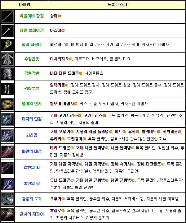 업데이트 이후 필드에서 등장하는 일부 몬스터가 고급 장비와 희귀 장비를 드랍한다. 특히 기란감옥과 용의 계곡 던전에서 드랍하던 희귀 무기를 필드의 일부 몬스터가 드랍하고 있으며 현재까지 확인된 드랍 정보는 아래와 같다.