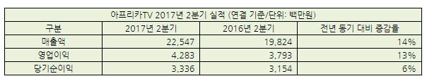 아프리카티비(대표 서수길)는 연결 기준 2017년 2분기 매출액 225억원, 영업이익 43억원, 당기순이익 33억원을 기록했다고 31일 공시했다.